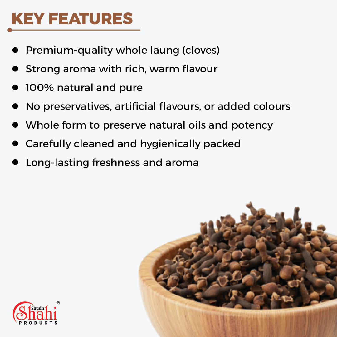Shudh Shahi Laung Deluxe brings bold flavour and aromatic warmth to a wide variety of dishes. It is widely used in biryanis, pulao, garam masala blends, gravies, and festive recipes. The slow release of flavour from whole cloves enhances depth and balance, making dishes more aromatic and flavourful. It is also valued for its role in traditional Indian cooking and spice infusions.